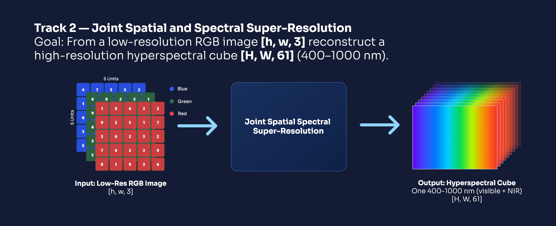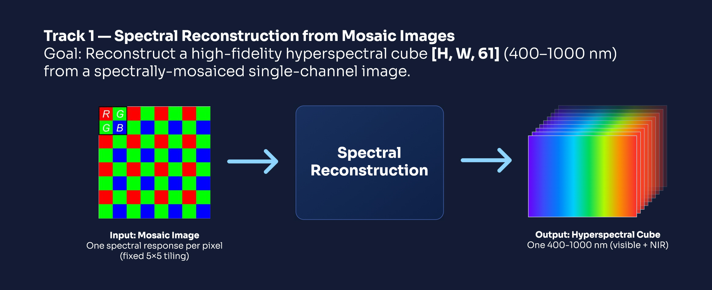 Each sample's output should be a 61-band hyperspectral image cube, matching the spatial resolution of the input (Track 1) or a defined high-res target (Track 2). Outputs must be saved in .npy